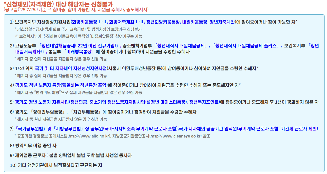 제도 중복을 막고, 혜택이 꼭 필요한 청년에게 돌아가기 위해 몇 가지 제외 조건도 있습니다.